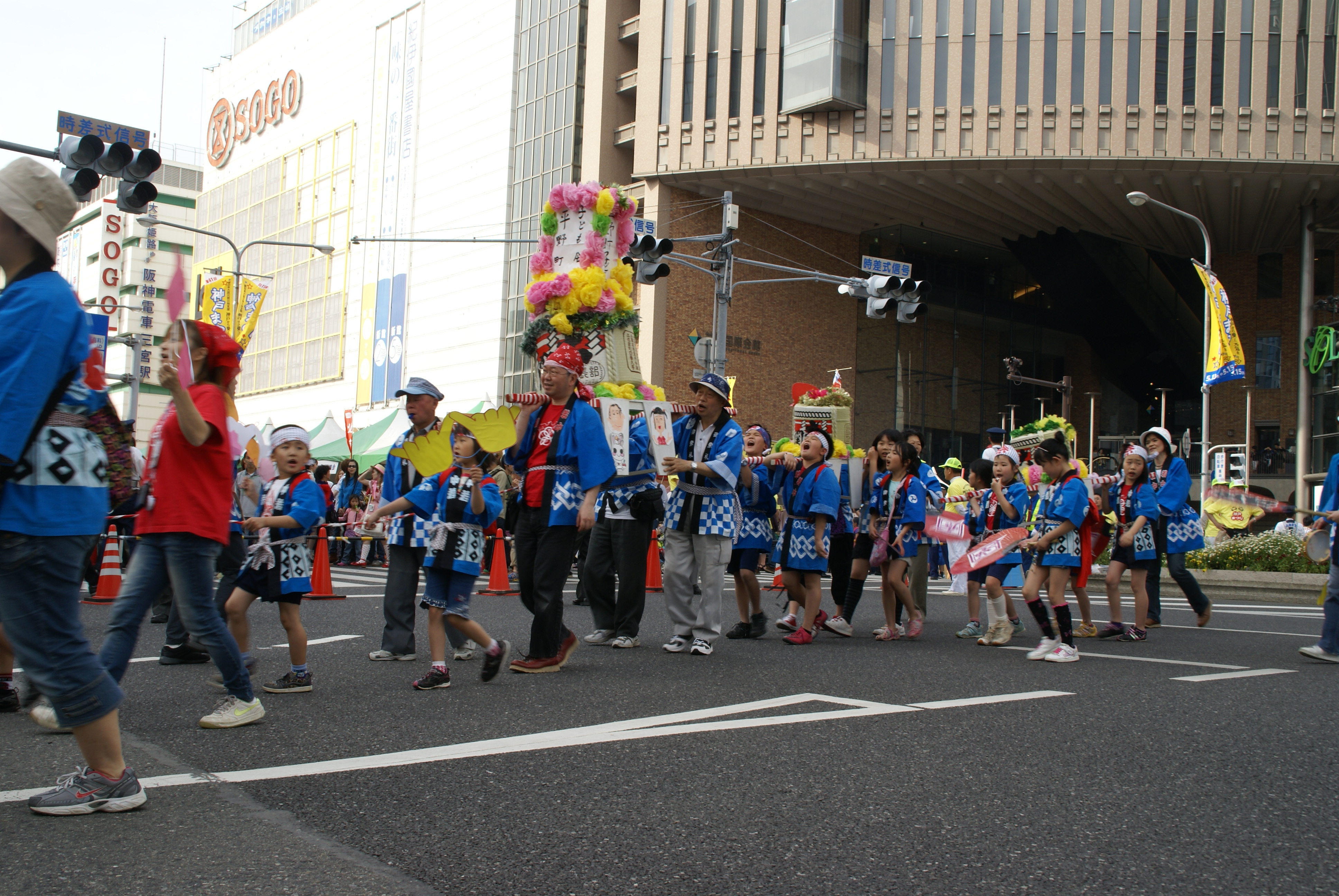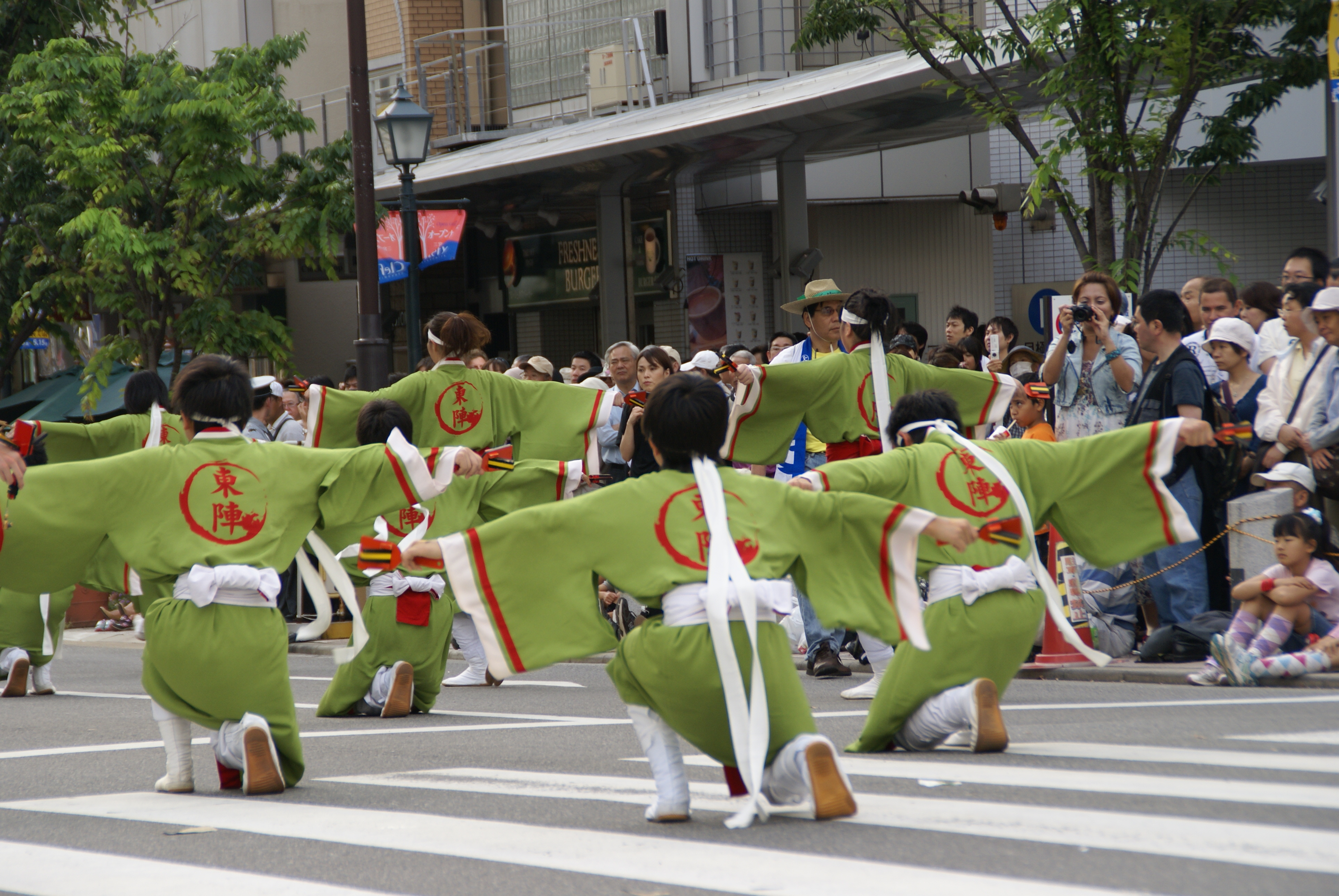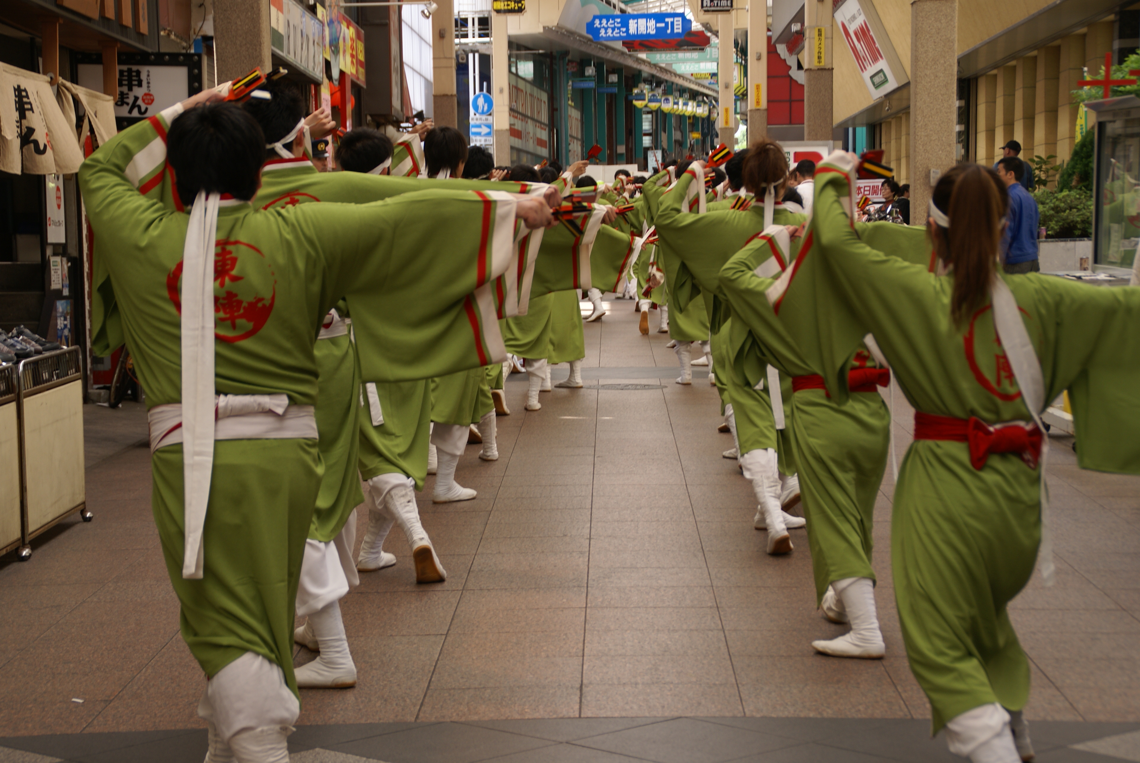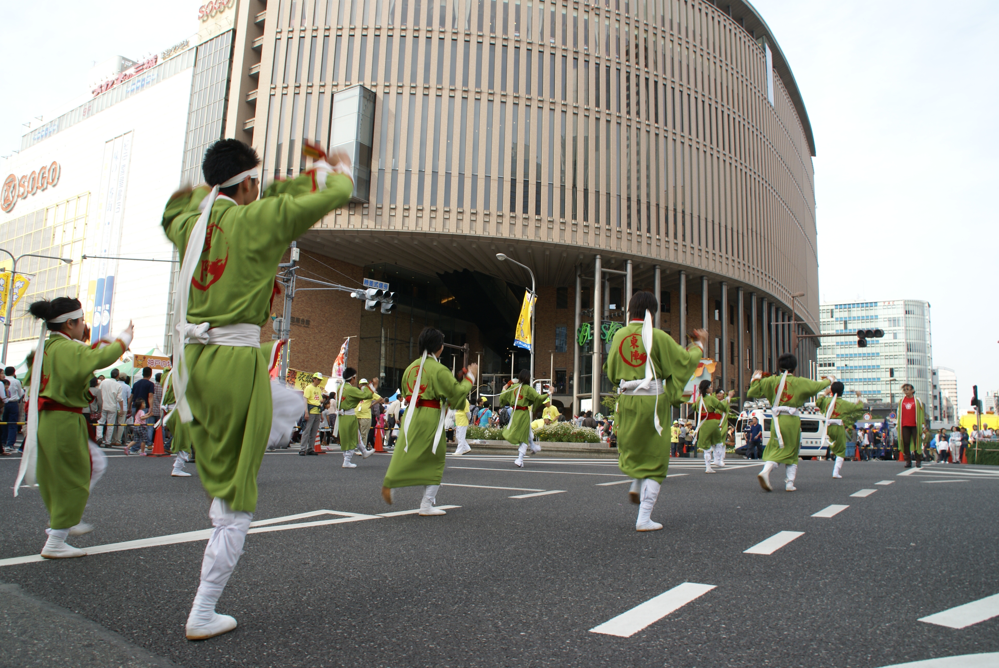 新開地パレードでは、 神戸東陣&平野町おみこし&歌舞伎時代行列で練り歩きました 湊川公園ステージのよさこい出演では、 3種類の衣装を披露し、総勢50人での乱舞です