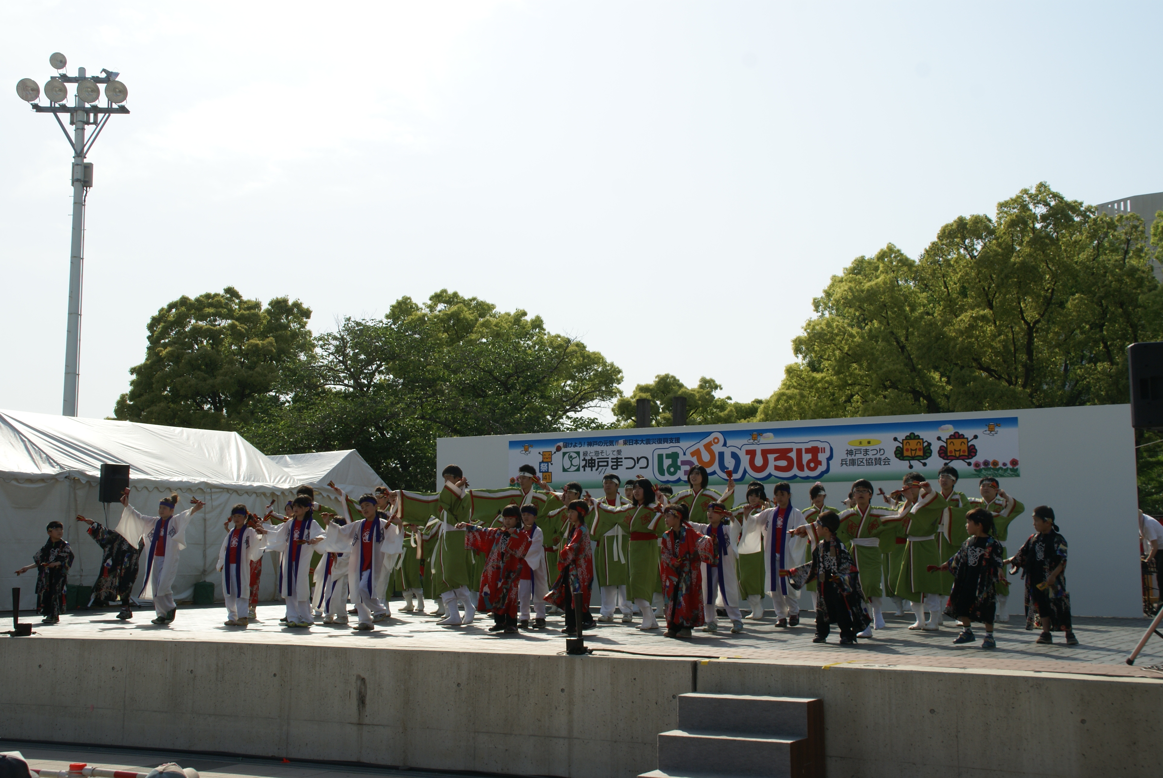 神戸東陣は覚えたての”よさこい2010”を乱舞初披露の衣装です 時代行列は手作りの衣装に身を包み、歌舞伎メイクもばっちり おみこしは「わっしょい!」に合わせ、 「がんばろう東北!がんばろう日本!」と力強い掛け声が響きました 被災地の方々へ元気が届きますように・・・
